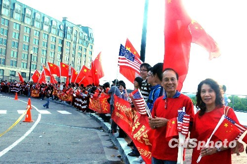 当地时间9月8日下午,正在美国访问的中国全国人大常委会委员长吴邦国飞抵美国首都华盛顿,开始此次访美行程中最受瞩目的一站。六百余名从费城等地赶来的华人华侨和留学生在吴邦国一行下榻的酒店热烈欢迎代表团。中新社发 吴庆才 摄