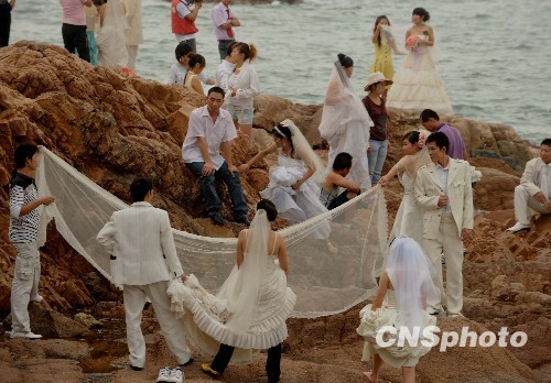 众多有情人把09年9月9日9时9分9秒视为千载难逢的六九相连美好瞬间,海滨名城青岛连日云集新郎新娘赶拍婚纱照,抓住良辰结婚。中新社发 贾国荣 摄