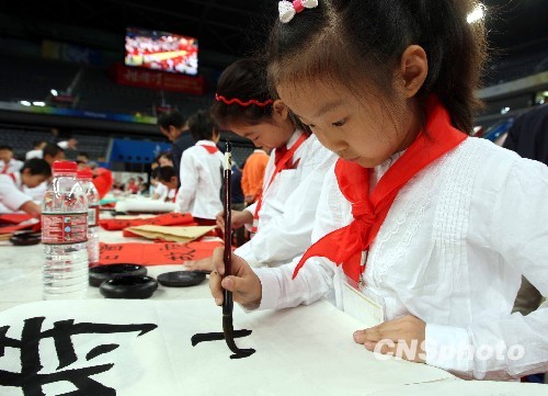 七岁半女童参加北京千人笔会盛迎国庆。中新社发 任海霞 摄