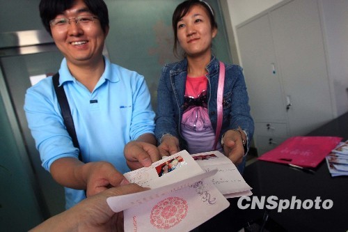 9月9日,新疆乌鲁木齐市天山区民政局婚姻登记处,一对恋人高兴地从工作人员手中接过结婚证,该登记处当天前来领取结婚证的新人比平日多了五、六倍。三九相逢,该市众多新人选择在当日登记领取结婚证,期盼自己的婚姻生活能够“天长地久”“长长久久”。中新社发 刘新 摄