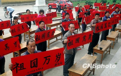 为了庆祝新中国60周年华诞,9月9日,山东省郯城县马头镇中心小学举办了一场别开生面的“写大字,迎佳节,抒情怀”展才艺活动,近百名教师现场用不同字体书写“祖国万岁”,祝福伟大的祖国繁荣昌盛。