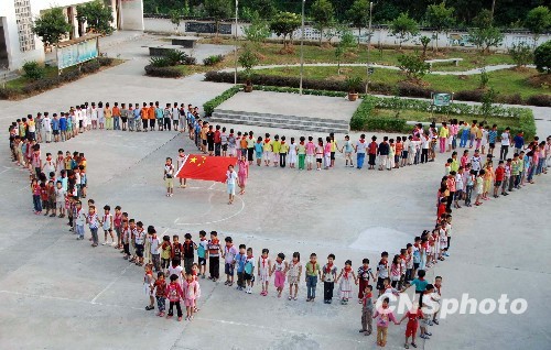 9月9日,婺源县溪头乡中心小学560名学生在校园操场上,手拉手拼成“祖国版图”。为喜迎祖国六十华诞,江西省婺源县溪头乡中心小学老师组织学生在操场上,站在事先划好的中国版图轮廓线上,由象征着全国56个民族的560名同学手拉手,通过升国旗、敬国礼、唱国歌等形式开展“祖国在我心中”教育活动。