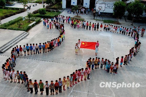 婺源县溪头乡中心小学560名学生在校园操场上,手拉手拼成“祖国版图”。中新社发 王国红 摄