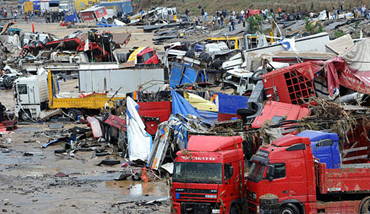 图为土耳其城市伊斯坦布尔一些在洪水中毁坏的汽车。