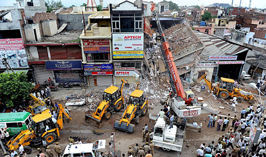 图为救援人员在发生坍塌的购物中心紧张工作。