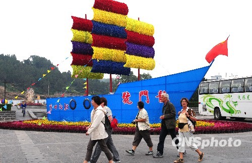 9月10日,河南省洛阳市世界文化遗产龙门石窟风景区大型彩船、巨型彩灯和鲜花造型群安装完毕,迎接国庆60周年的到来。