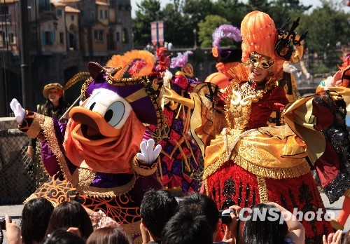 图为迪斯尼明星唐老鸭身着色彩绚丽的万圣节礼服跳起了欢乐的舞蹈。中新社发 关妍 摄