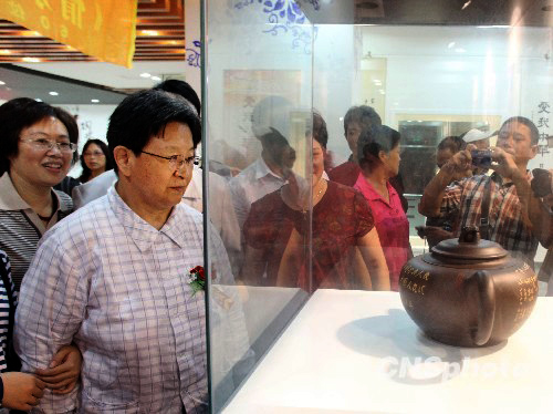 9月10日,庆祝中华人民共和国成立60周年《“情系中华·鼎盛中华”60名壶陶艺展》于宜兴市开幕,毛主席的女儿李讷、女婿王景清、毛主席纪念堂管理局原局长徐静等专程从北京赴宜兴表示祝贺。 这60把紫砂茶壶由江苏省工艺美术名人顾治培、高级工艺美术师范伟群等60位陶艺工作者专为庆祝祖国60华诞而创作,并由向守志等60位名人名家题签,使书法艺术与宜兴紫砂艺术珠联壁合、相得益彰,表达了对伟人毛泽东的深情厚意,唱出对祖国六十华诞的生日赞歌。今后,这些作品将博览中心长期展示,成为陶都宜兴的一道文化景观。 中新社发 丁焕新 摄