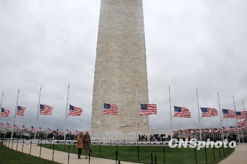 图为美国华盛顿中心区的方尖碑周围五十面美国国旗降半旗,悼念八年前在恐怖袭击中的遇难者。中新社发 吴庆才 摄