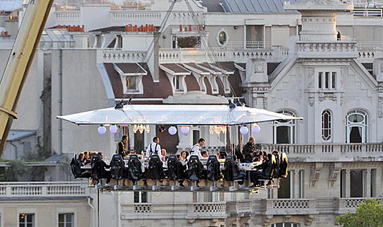 9月11日,在法国巴黎,人们在距离地面50米的“空中餐厅”享受晚餐。此次活动由一家饮食杂志组织发起,每次可接待22人同时用餐,活动预计持续5天。