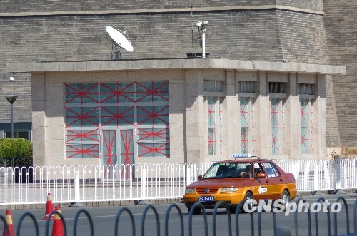 为防止天安门广场周边地区的窗户出现破碎现象,公共建筑及住宅的玻璃都上了米字形胶条。中新社发 玉龙 摄