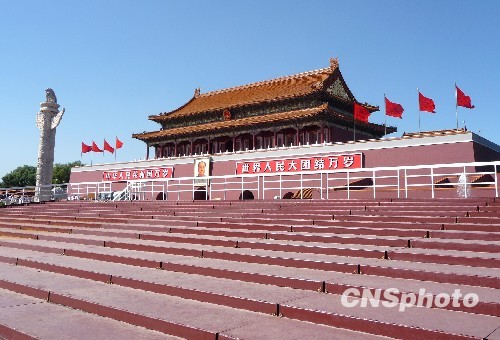 9月12日,北京天安门城楼两侧观礼台前数百平方米的临时观礼台已搭建完毕。红色基座、白色栏杆,基本与原观礼台保持同样风貌。据悉,当晚22点天安门广场将进行第三次建国60年国庆盛典演练,并燃放焰火。目前一切安全保障措施全部到位。