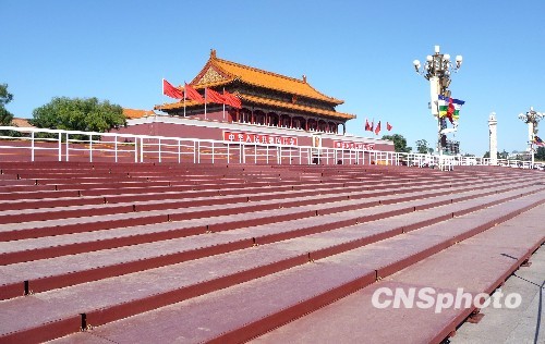 北京天安门城楼两侧观礼台前数百平方米的临时观礼台已搭建完毕。中新社发 玉龙 摄