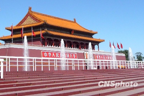 北京天安门城楼两侧观礼台前数百平方米的临时观礼台已搭建完毕。中新社发 玉龙 摄