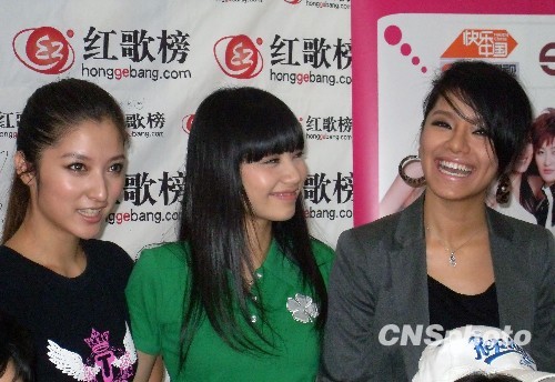 媒体见面会现场,快女笑答记者提问(从左至右依次为:潘辰、刘惜君、江映蓉)。中新社发 郭宁 摄