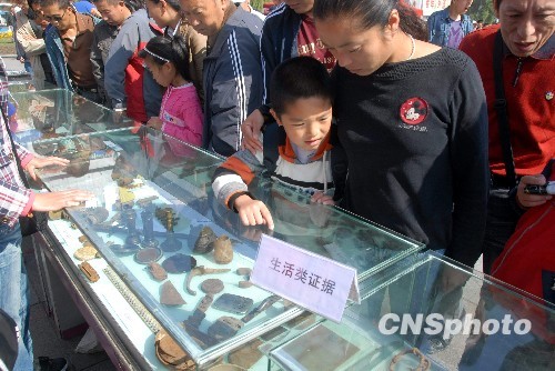 黑龙江省牡丹江市文化广场举办了“侵华日军罪证展”,百余件侵华日军使用过的物品以及图片资料吸引了很多市民驻足观看。中新社发 高福贵 摄