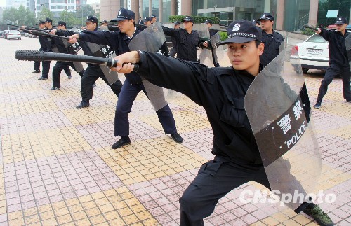 9月14日,山东省聊城市特警支队特警队员在进行警棍盾牌操训练。根据即将举行的第十一届全运会安保任务,特巡警队员开展了警务实战技能训练,包括处突防爆、警棍盾牌操、擒敌拳、警务实战技能等九项内容。聊城是2009全运会协办城市之一,将举行篮球和公开水域游泳两项比赛。中新社发 孔政 摄