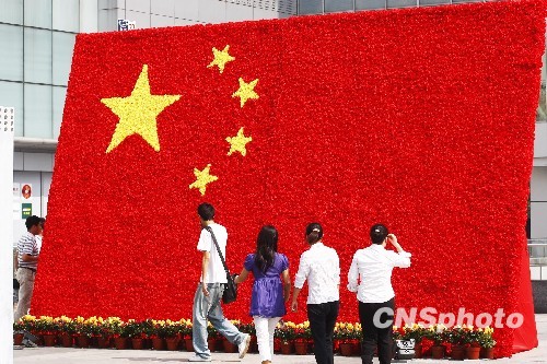 9月14日,北京CBD乐成中心写字楼前广场上,近两万朵玫瑰绢花编织“五星红旗”喜迎国庆60周年,鲜艳的中国红图案吸引路人纷纷驻足欣赏。中新社发 郑雄增 摄