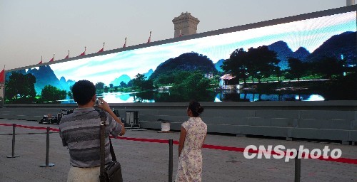 2009年9月14日傍晚,北京天安门广场,为迎接国庆60周年,两块液晶电子巨型屏幕已安装完毕并开始调试,播放的京城新貌及祖国各地的优美风光吸引了游客的目光。中新社发 玉龙 摄