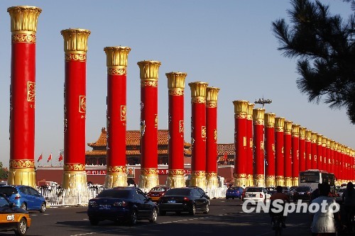 9月15日,28根巨大的民族团结柱在天安门广场东侧竖起,吸引不少游客的目光。这些柱子能抗瞬间十一级大风,还安装了避雷针。作为新中国成立六十周年国庆庆典背景之一,天安门广场计划安置56根民族团结柱,每根民族柱13.6米高,26吨重,以“中国红”和“金色”为主色,柱子上均绘有一对穿着民族服装的男女舞者,代表中国56个民族。中新社发 郑雄增 摄