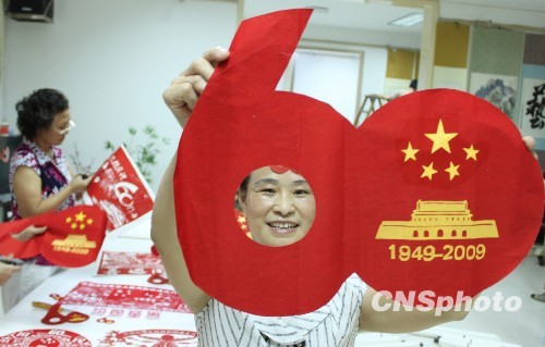 安徽繁昌老年大学剪纸艺术班学员翟晓玲等展示“欢庆祖国六十华诞”的剪纸技艺。 中新社发 牧易 摄