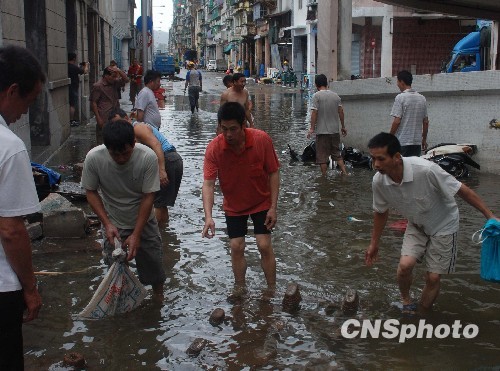 图为内港经营海鲜的商户在积水中捕捉从店内游走的海鲜,以减少损失。中新社发 毕永光 摄