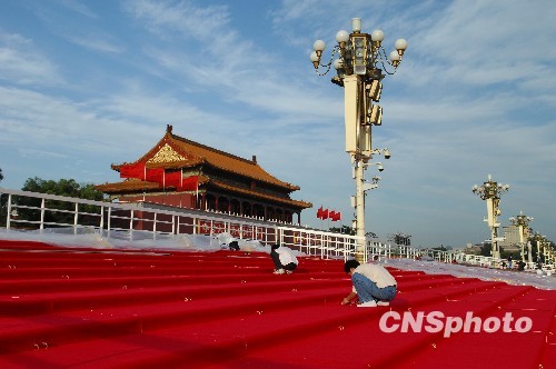 9月15日下午,工人们在天安门城楼前的临时观礼台上铺设红地毯。城楼前的4个面积达数百平方米的临时观礼台都将铺上红地毯,增添节日喜庆气氛。