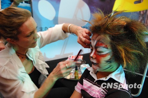 图为一名北京小男孩有幸接受音乐剧首席化妆师的“照顾”,被装扮成一只“小猫”。中新社发 侯宇 摄