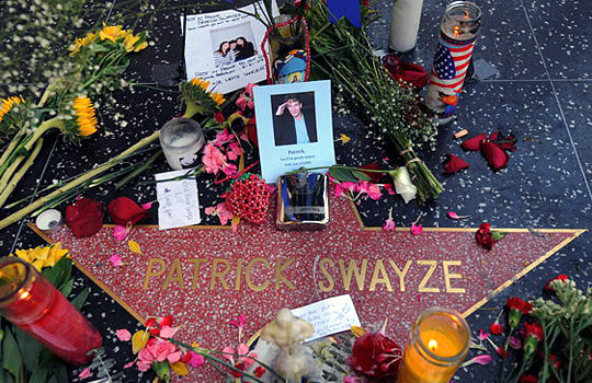 9月15日,演员帕特里克·斯韦兹的影迷将鲜花和蜡烛等物品摆放在刻有帕特里克姓名的好莱坞星光大道上寄托哀思。美国经典影片《人鬼情未了》男主角帕特里克·斯韦兹在与胰腺癌抗争了近两年时间后,于14日病故,终年57岁。
