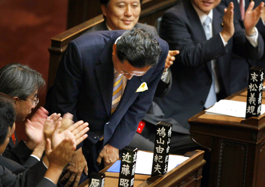 图为日本民主党党首鸠山由纪夫在当选首相后起立接受议员的祝贺。
