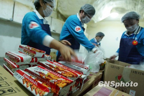 9月16日,承担国庆六十周年群众联欢队伍食品供应的北京二商集团食品配送中心,向媒体开放。该中心负责3次国庆演练及“十一”当天总共4次活动中,群众游行队伍的早餐供应工作。活动每次用餐数在11.7万人,配送地点为110至120个,供应量大,供应时间集中。二商集团组建了440人的志愿者队伍,投入到此次任务中。图为工作人员正在分拣第3次演练时需供应的食品。中新社发 富田 摄
