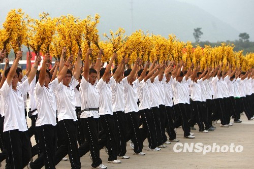 9月16日,参加国庆游行表演的群众方队在北京密云训练基地进行合练。中新社发 杜洋 摄