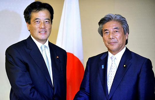 图为日本新外相冈田克也(左)与前外相中曾根弘文在东京日本外务省会面。