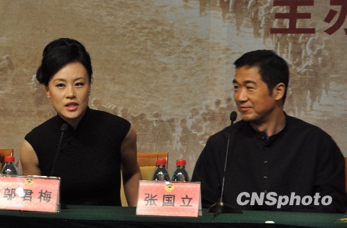 9月17日,众多两岸三地明星参演的电影《建国大业》举行重庆首映式。据称,重庆首映式是该剧在中国内地8个城市举行的最后一个首映式,剧中部分主要演员也来渝宣传该片。图为剧中扮演蒋介石和宋美龄夫妇的张国立(右)和邬君梅出席首映式新闻发布会。中新社发 曹多然 摄