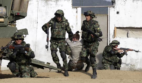当地时间9月17日,在保加利亚首都索菲亚的一个军事基地,保加利亚士兵和美国士兵举行了一次联合军事演习。