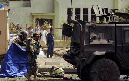 9月17日,在从阿富汗首都喀布尔市中心通向机场的路上,一个意大利的北约车队遭到自杀式汽车炸弹袭击。目前死亡人数已达16人,包括10名平民,6名意大利士兵,另外有55人受伤。