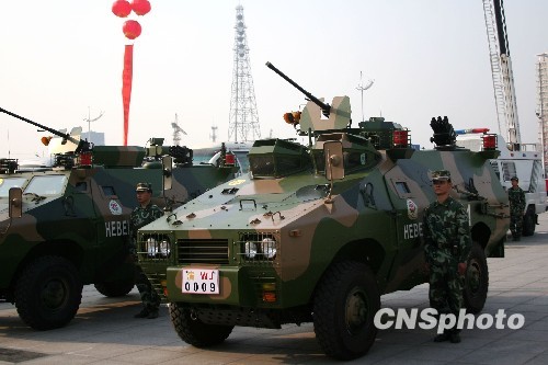 图为参加演练武警及车辆在制定地点集结。 中新社发 李光 摄