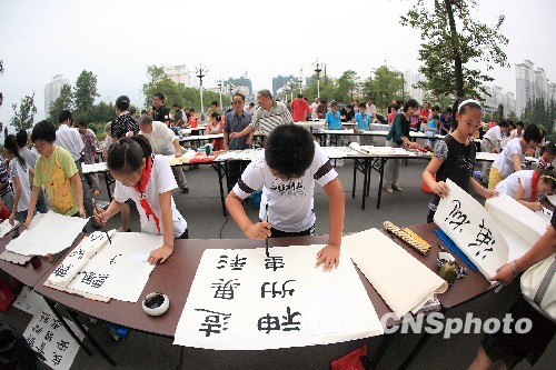 9月17日,在浙江省台州市黄岩区政府大楼前,祝愿祖国好——橘乡儿女书画长卷颂活动正在这里举行,60名老中青少书画爱好者用画笔描绘出自己心中美好的祖国,表达橘乡儿女对祖国和家乡的深切祝福。中新社发 张聆听 摄