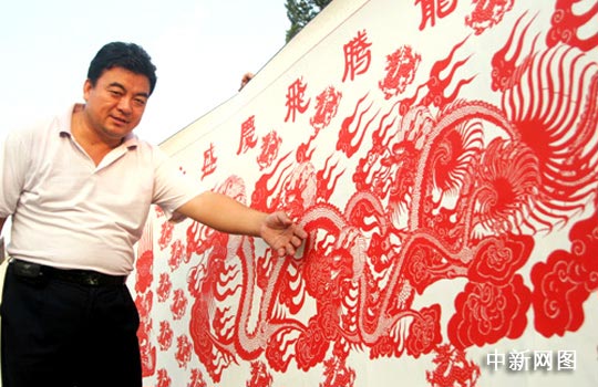 中新网9月18日电(高增平 张跟慧) 9月17日,山西侯马市民间艺术家赵宏平正在展示他最新创作的剪纸作品《巨龙腾飞庆盛世 振兴华夏颂富强》,表达了对祖国60华诞的美好祝福。