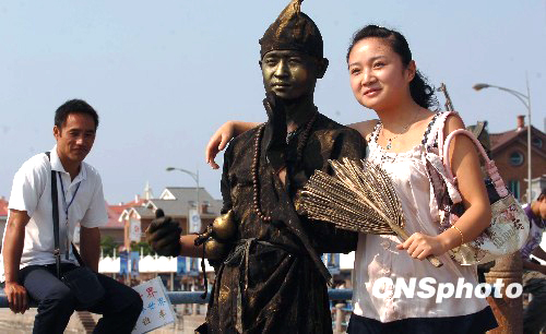 9月18日,两名游客在青岛五四广场同装扮成中国军人和济公和尚的活体雕塑合影留念。秋季,气候宜人的山东旅游城市青岛,引来国内外大批游客前来观光。中新社发 邹宪 摄