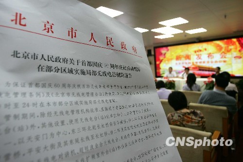 9月18日,北京市无线电管理局召开新闻发布会,通报国庆日当天北京地区将进行无线电管制。据北京市政府通告,十月一日零时起至二十四时,北京部分区域实施局部无线电管制。这是继九月三日工业和信息化部发布无线电管制规定后的又一通告。管制令要求,除经批准、直接用于新中国六十周年庆祝活动的无线电台(站)外,其他设置、使用无线电台(站)的单位和个人必须停止使用设备。中新社发 富田 摄