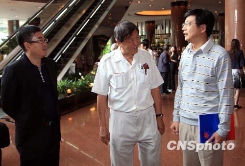 9月18日,世界华文传媒领军人物纷纷抵达上海,准备参加19日开幕的“第五届世界华文传媒论坛”。中国新闻社社长刘北宪(右)与马来西亚世华媒体集团董事会主席张晓卿(中)等在此相逢。据了解,该论坛将有四十六个国家和地区的三百五十多家媒体代表及中国国内一百多家媒体代表参会,他们将就“全球金融危机下的华文媒体”主题进行探讨。中新社发 潘索菲 摄