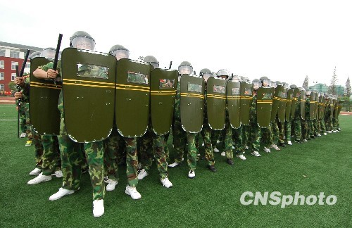 9月18日,江苏省扬州大学广陵学院新生军训拉开序幕。与往年不同的是,该校今年军训增加了反恐防暴,使用消防灭火器等全新性军事技能练习。中新社发 扬州高钱 摄