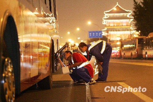 9月18日夜,新中国成立60周年庆典活动进行最后一次综合演练。北京公交集团公交保修分公司的22个保障小组,负责对天安门南北区13个停车场和长安街5个集结地停车场承担演练服务任务的2100余部公交车实施“例行检查”和“问修”工作,确保服务车辆安全行驶。图为保修三厂的保障人员正在对车辆进行例行检查。中新社发 富田 摄