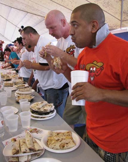 9月18日,世界吃卷饼大赛在美国新墨西哥州举行,众高手使出浑身解数,争当“大胃王”。最终一位名叫Shoudt的选手,在10分钟内吃了33个半卷饼夺得冠军。