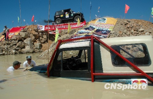 图为19日上午举行的外围表演赛中,两名英国车手驾驶的赛车深陷水坑。中新社发 尹海明 摄