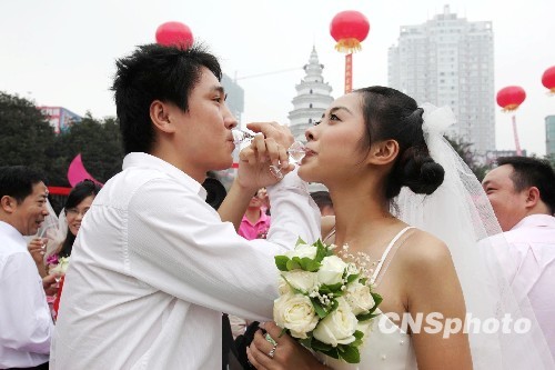 新中国60岁生日将近,四川泸州60对新人9月19日集体“拜堂”,与祖国同喜。中新社发 牟科 摄
