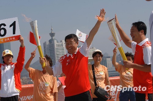 九月十九日,采自泰山火种的第十一届全国运动会火炬“如意”在青岛海滨及奥帆体育中心等地开始传递,此活动标志着以“祝福祖国共享全运”为主题的十一运会火炬传递活动在山东省拉开帷幕,奥运冠军、青岛籍著名射箭运动员张娟娟等145名火炬手和11名群众火炬手及4万名青岛民众参加了这项活动。图为来自各界的145名知名火炬手依次传递火炬“如意”。中新社发 邹宪 摄