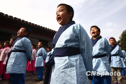 9月20日,打扮成私塾学童模样的孩子在路边大声背诵三字经。孔庙国子监文化节活动在北京国子监博物馆开幕,此次文化节的主题是“文化孔庙、国学圣地、人文北京”。9月28日是孔子诞辰日,今年是孔子诞辰2560年。中新社发 杜洋 摄