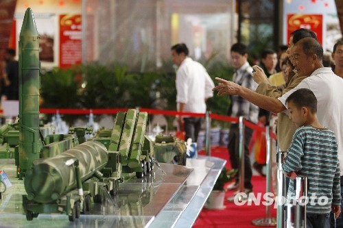 图为国防单元展区展出的海陆空三军装备模型吸引参观者。中新社发 盛佳鹏 摄